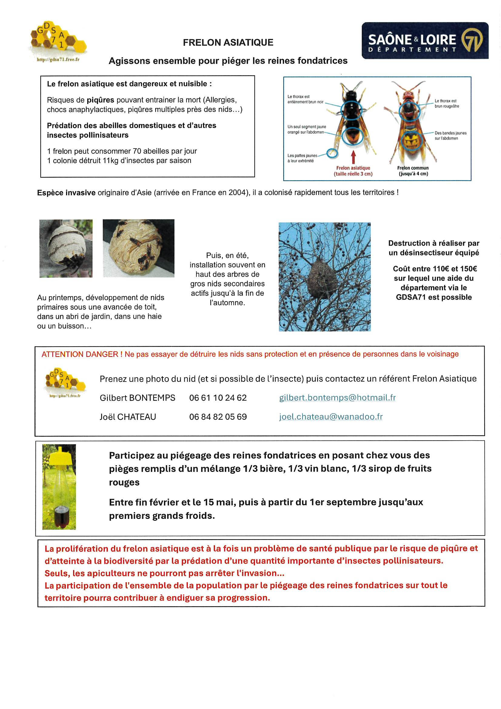 Le Groupement de Défense Sanitaire Apicole de Saône-et-Loire vous invite à agir dès fin février en posant des pièges sur vos terrains dans votre commune et ses hameaux, pour piéger les reines fondatrices et ainsi éviter de nombreux nids coûteux à détruire plus tard dans l’année.